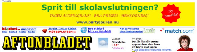 Reklammakarna upphör aldrig att förvåna. Aftonbladet har idag reklam för sprit till studentfester utan åldersgräns. Först trodde jag det var ett skämt men det verkar inte så. Man lovar bra priser och dessutom utan åldersgräns.