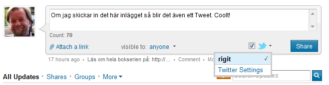Twitter & Linkedin Publicerat på 27 januari, 2011 av Rolf Granlund Nu har jag även kopplat på en funktion som medför att mina inlägg (posts) i Linkedin även blir ett tweet i @rigit. Så jag kan varmt rekommendera Twitter. Dela detta: Klicka för att dela på X (Öppnas i ett nytt fönster) X Klicka för att dela på Facebook (Öppnas i ett nytt fönster) Facebook Gilla Laddar in …