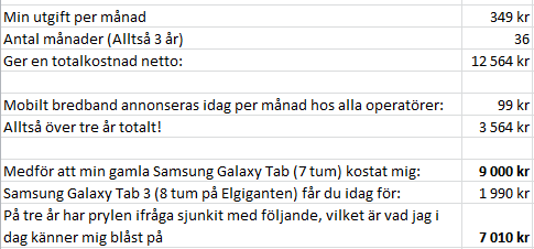 När de tre åren är till ända så åker jag till Teliabutiken i Sollentuna och dänger det mobila USB-modemet i disken samt säger upp abonnemanget. Min gamla pekplatta behåller jag för den har jag betalt! Kanske funkar den som bokstöd?