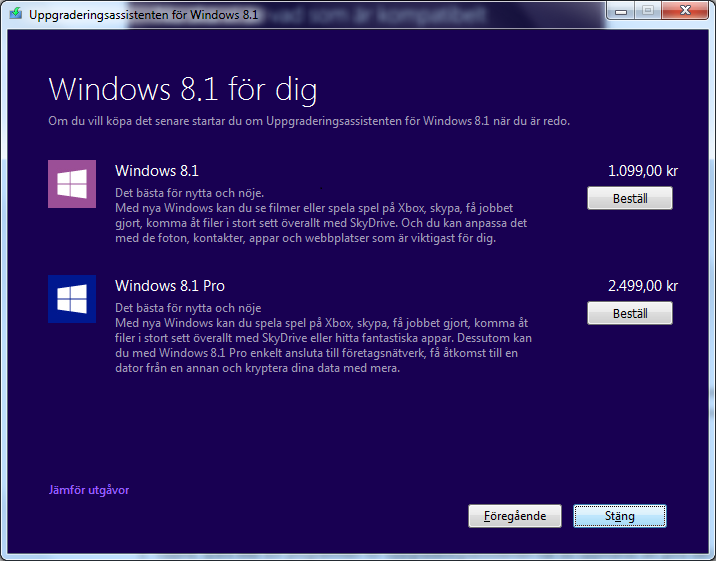Ovanstående bild har alltså skapats av programmet Uppgraderingsassistenten som kollar om det överhuvudtaget går att uppgradera datorn. Alltså om man väljer att ladda ner via nätet samt betala och installera från Microsoft.se.
