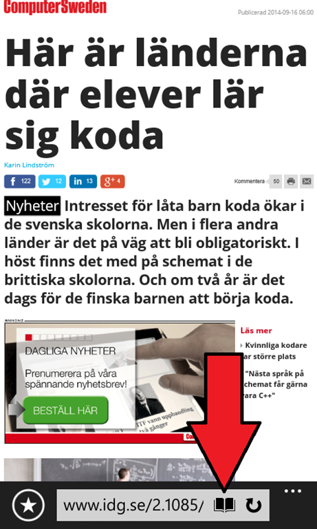 Internet Explorer 11 har försetts med en ny Läsvy i likhet med den som sedan tidigare finns i Word.