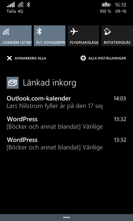 Utöver att hantera WiFi-anslutningar, Bluetooth, Flygplansläge samt den för mig helt onödiga Rotationslås så finns “Alla Inställningar” där, så funktionen Inställningar (Kugghjulsikonen) har jag numera tagit bort från startskärmen eftersom jag tidigt placerade den där.