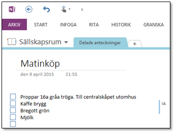 Ett antal listor typ vad sambon och/eller jag ska handla på COOP, IKEA, Clas Ohlson, Apoteket med mera. OneNote hanterar en massa saker som jag sett att andra har som skilda appar i sina iPhone eller Android-lurar. Jag har lagt upp ett antal rubricerade listor som ligger i en mapp i min OneDrive som jag omedelbart delade ut behörigheten till. Så Irene och jag kör samma filer. I början innan vi lärt oss så krockade våra uppdateringar speciellt när vi bearbetade inköpslistor i affären. Men nu har vi lärt oss hur vi ska göra för att få det att fungera. Vi synkar manuellt rätt ofta. Dessutom har vi kommit överens när vi rensar inköpslistorna. Inte i affären utan när vi kommit hem. Listorna har alltid klickrutor så att vi ser när vi tagit en vara och lagt i vagnen. Hur bra som helst. Papperslappar är därmed blott ett minne från förr. - PowerPoint 2013 RT