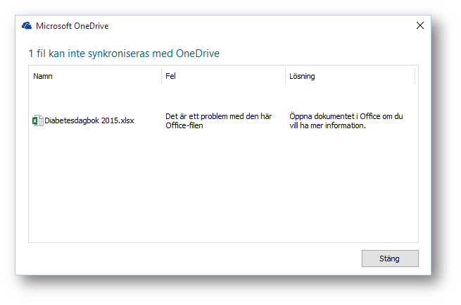 Efter ett tag kom jag på vad det kunde bero på och efter att jag tagit bort samtliga cellkommentarer som jag skrivit via min Surface RT så klarade OneDrive i Windows 10 att synkronisera min Excel-fil. Så kan det gå…