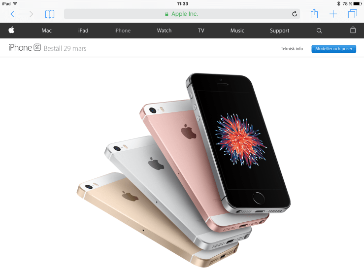 Så nu på morgonen till frukost så blev det till att surfa på Paddan istället för Nokian. Så jag gick in på Apples sida för att läsa om iPhone SE, vilket verkar vara en iPhone 5S med iPhone 6-teknologi innanför skalet. Inte så dumt faktiskt! Habegäret väcktes. Nu har jag ju redan min iPAD mini 2 om jag vill köra storskärm, så en större iPhone 6 lockar inte.