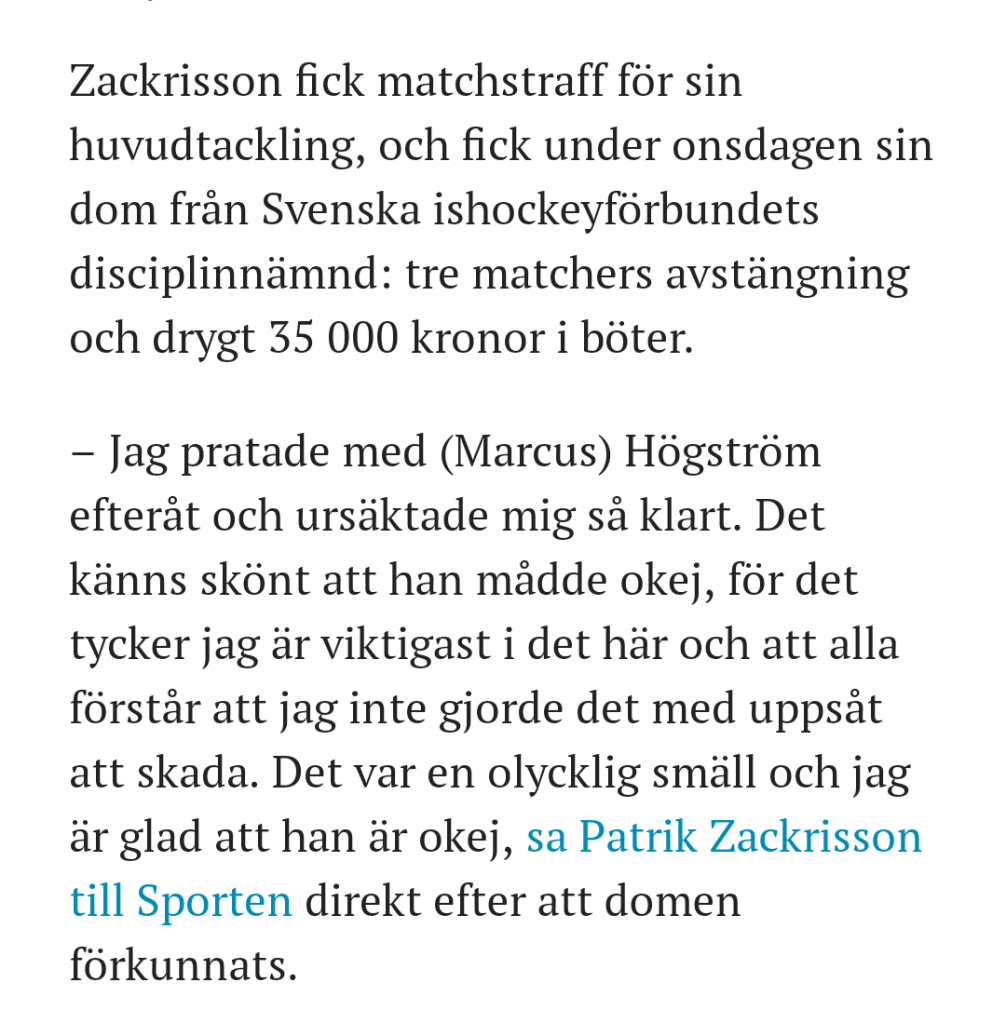 Patrik Zackrisson var mest lättad av att Marcus Högström mår bra och att Patrik accepterar avstängning i tre matcher plus böter.