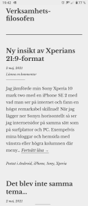 När jag lägger ner Sonyn horisontellt så ser jag internetsidor på samma sätt som på surfplattor och PC. Exempelvis mina bloggar och hemsida med vänstra eller högra kolumnen där meny och widgets finns. Dessa ser man inte i iPhones 16:9-format.