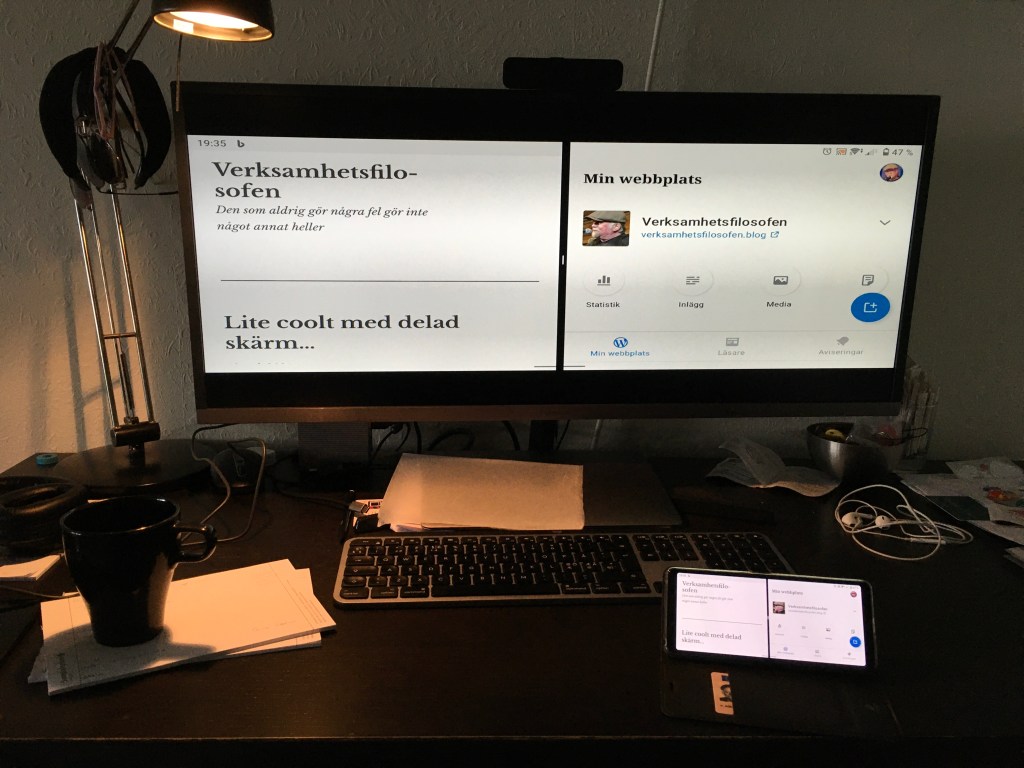 Tur att jag inte skaffade kablar. Det blev inte som jag önskade mig, nämligen att köra fler appar på den stora skärmen. Det enda som fungerade var delad skärm och som jag körde med telefonen i horisontalläget. Inte ens det blev bra.