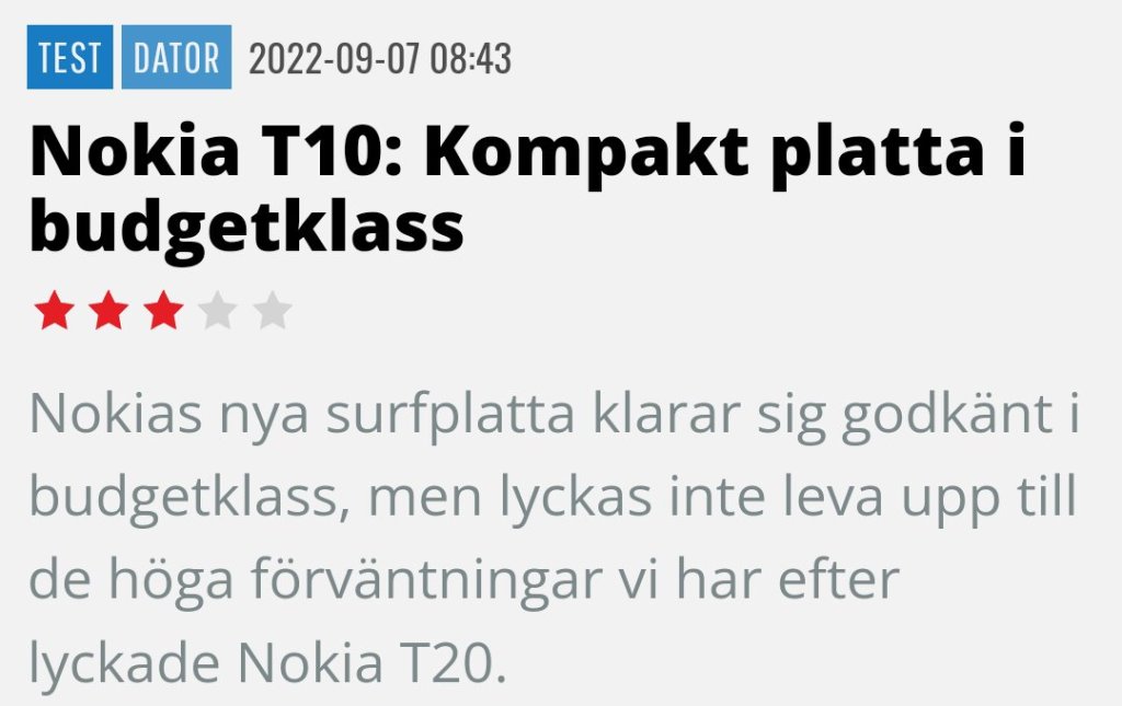 Mattias testade ”Te-tian” från ett helt annat så kallat ”mindset”. Med intrycken från den större ”Te-tjugan” så har alltså den mindre och billigare surfplattan ingen chans. Den får negativa omdömen redan från start och det håller i sig under hela testen. Se bilden ovan med ingressen där Nokia T10 ”inte lyckas leva upp till förväntningar”. När jag köpte och började använda min T10 så överträffade den mina förväntningar! Det är skillnad det!