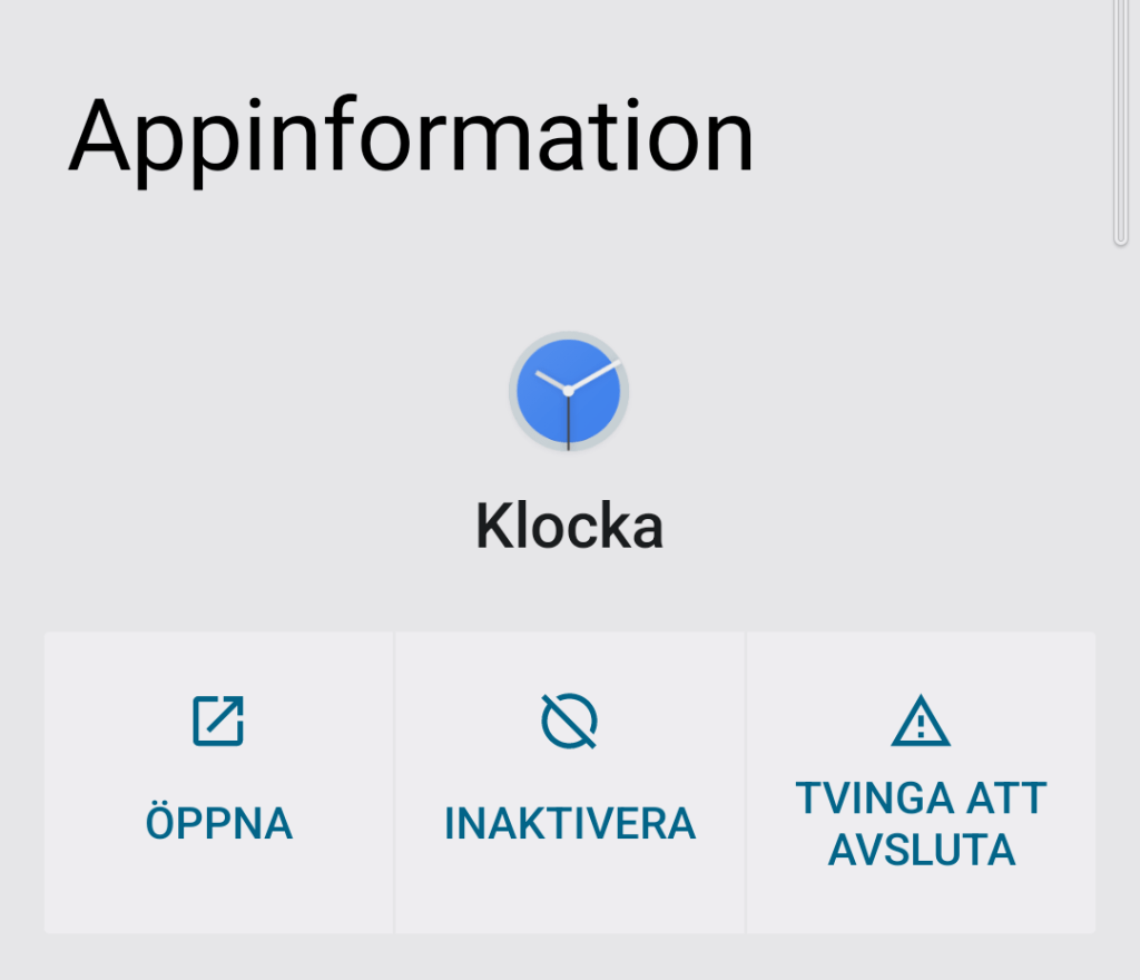 Nästa åtgärd var alltså att leta reda på appen i Google Play Butik. Väl där fanns inte alternativet Installera utan istället Aktivera! Efter den åtgärden var problemet löst, klockan digital igen och mina inställningar för väckning på plats igen under funktionen Alarm.