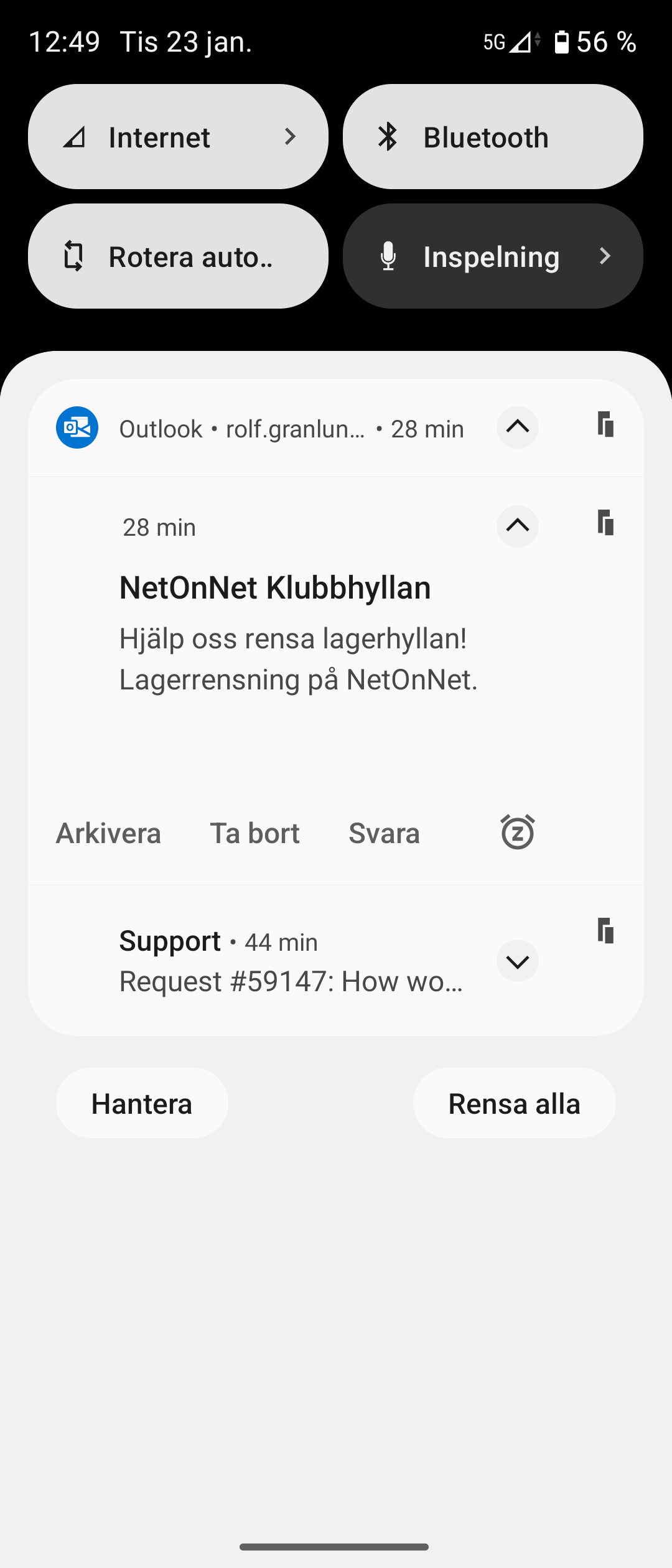I aviseringen kan jag expandera aviseringen lite grann för att få en fingervisning om vad mejlet handlar om. Reklam-mail är ofta ganska lätta att avgöra vad det handlar om, så då kan jag oftast direkt Ta bort mejlet som då hamnar i Outlooks mapp ”Borttaget” utan att jag behöver öppna Outlook.