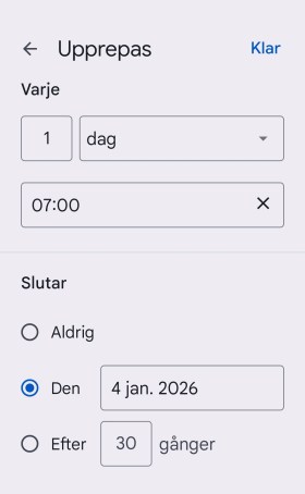 Sätt Dagligen för varje tidpunkt plus sista datum när pillren ska tas. Fältet heter där ”På datumet”.