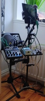 Ministudion består nu av min lilla Behringer, lilla Yamahamixern, choruspedal på nya lätta plasthyllan, två olika mickstativ ett litet och ett fullstort. Dessutom några korta patch-kablar typ tele och XLR. Men här behöver jag inte den stora surfplattan.